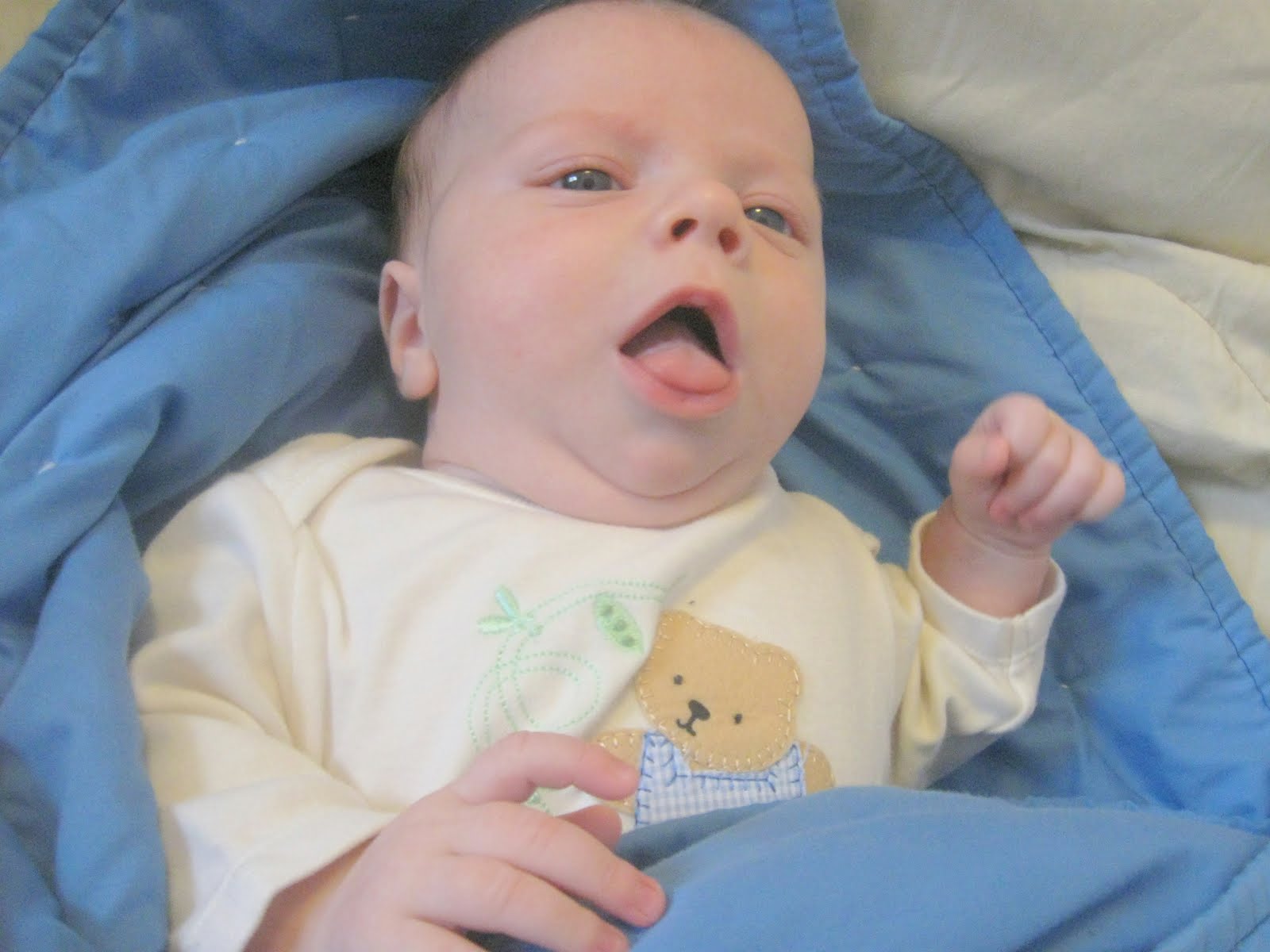Ever since we caught him smiling last week, we've been busy catching more smiles. I weighed him this afternoon at 11. 4 pounds. Last week he weighed 10. 4 pounds in the morning. So, yes he gained a whole pound, which means he's gained five pounds in seven weeks since he was born weighing six pounds four ounces.